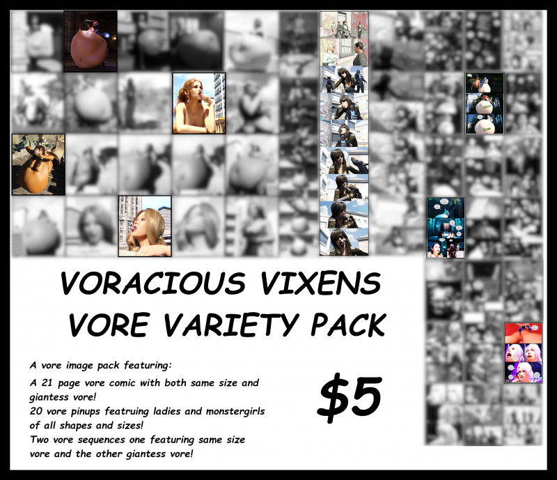 Voracious Vixens Vore Variety Pack features a huge number of vore images from pinups to full comics. With hungry ladies of all shapes and sixes, from thin to fat, from short to mega giantess.